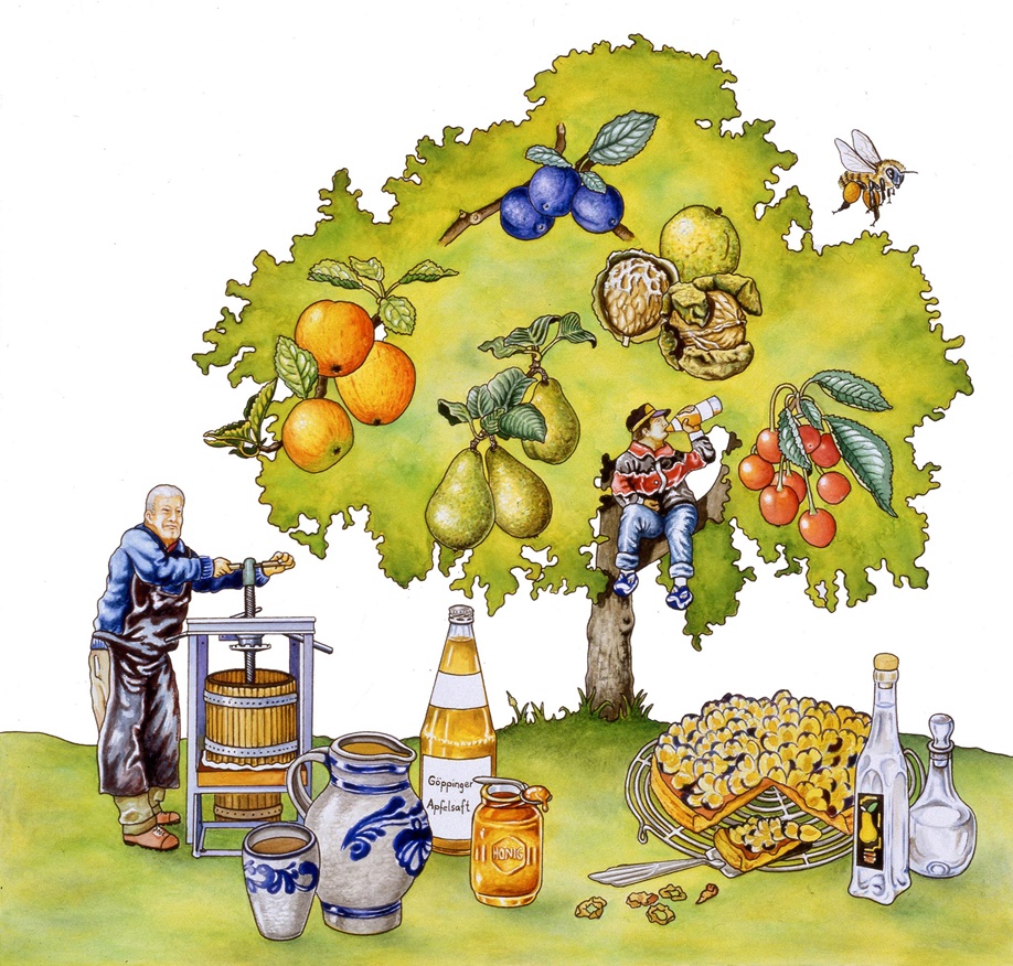 "Apfelkuchen sehr fein", frisches Zwetschgenblatz mit Sahne, Birnenkompott, Apfelmus und Zwetschgengsälz, Früchtebrot und Hutzeln - das sind nur einige Leckereien aus der Streuobstküche. In flüssiger Form ist der Apfelsaft und für erwachsene Schwaben der Most ein idealer Durstlöscher. Und ab und an ein gutabgelagertes Goißhirtlesdestillat, Zwetschgenwässerle oder Kirschedelbrand - da wird nicht nur der Schwabe zum Naturschützer.